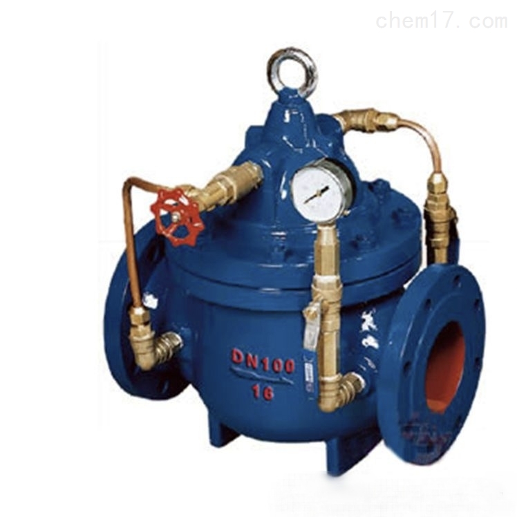 当阀门从阀前端给水时,水通过微型过滤器、针型阀、单向阀进入主阀控制室,再经过球阀排水至下游。因为针型阀开度小于球阀开度,即主阀控制室的排水速度大于进水速度,因此控制室压力降低,作用于主阀盘下端的阀前压力打开主阀向下游供水。当管道停止供水时,若下游水开始回流,一部分回流水经球阀进入主控制室,由于单向阀作用,回流水不能从主控制室流出,引起主控制室逐渐升压,缓缓关闭主阀。